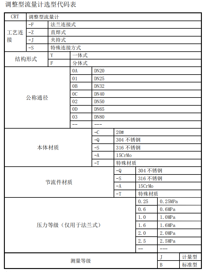 例:CR T -F Y 04-C -Q 1.6 J 调整型流量计,一体式法兰连接,公称通径为DN100,本体材质为 20#,节流件材质为304,压力等级 1.6MPa,计量型。以上就是调整型流量计的产品介绍。